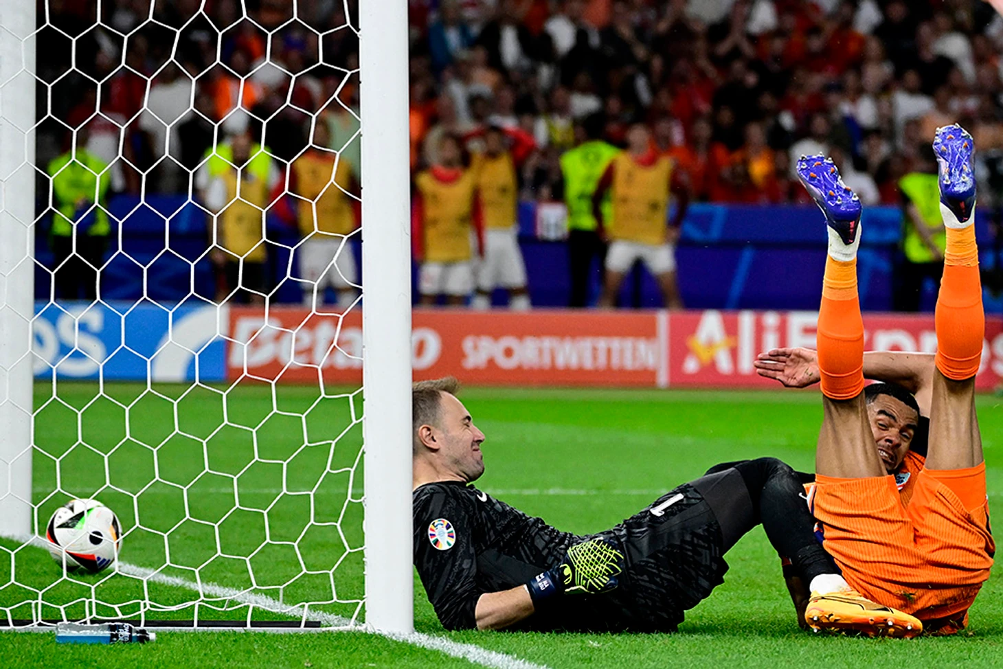 Нидерланды – Турция. Коди Гакпо и Мерт Гюнок в странных позах, а мяч под шумок заползает в ворота.