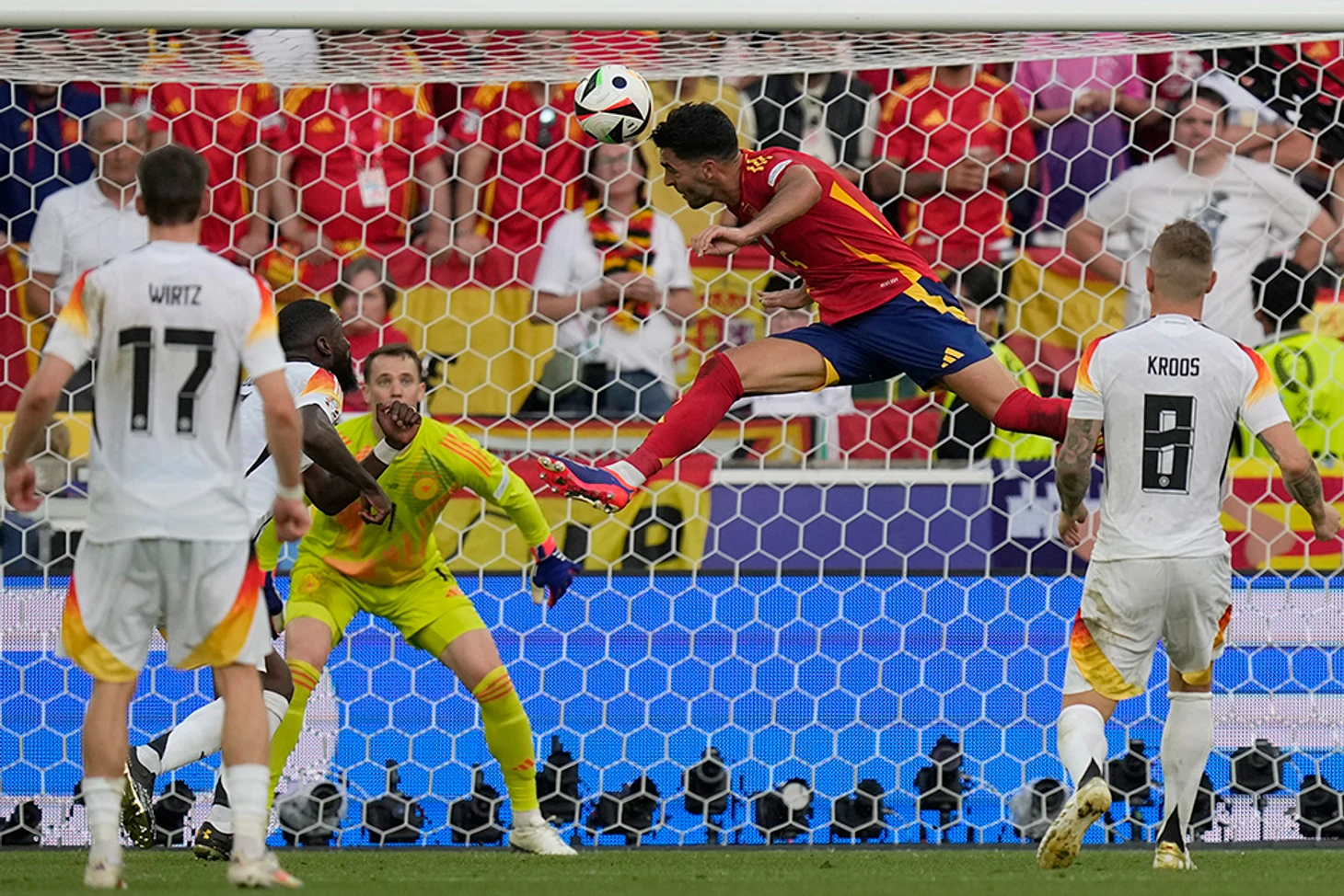 Сэйв года. Дани Ольмо головой выбивает мяч с ленточки.