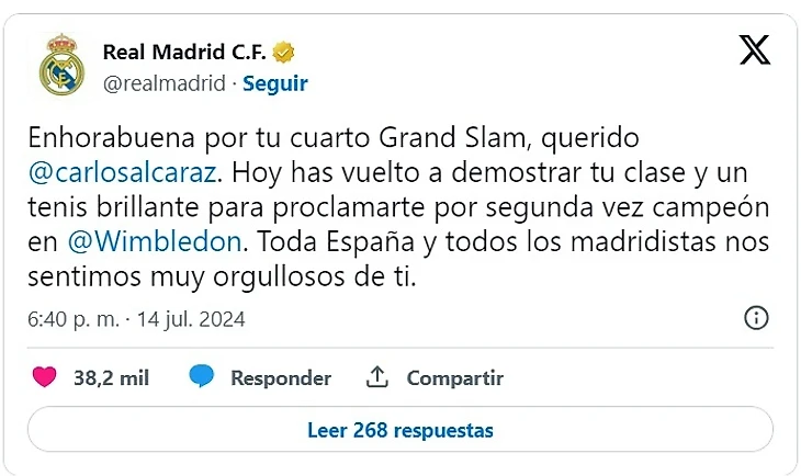 «Поздравляем с твоим четвертым Большим Шлемом, дорогой Карлос Алькарас. Сегодня ты снова показал свое мастерство и блестящий теннис, во второй раз подряд став чемпионом «Уимблдона». Вся Испания и все мадридисты гордятся тобой».