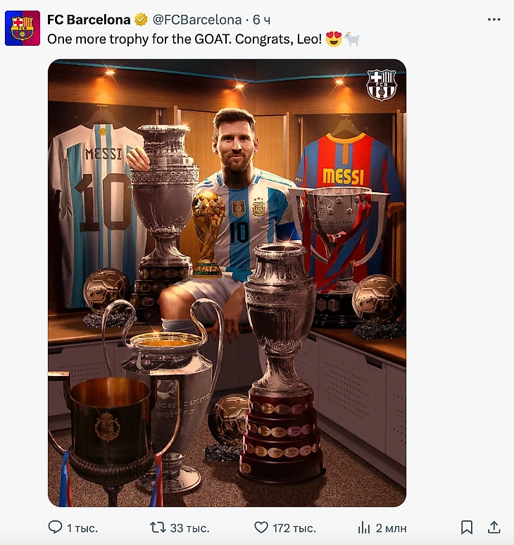 «Еще один трофей для величайшего. Поздравляем, Лео! 😍🐐», – говорится в сообщении «Барсы».