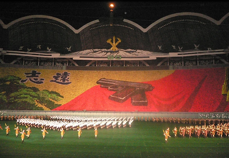 Изначально это был корейский фольклорный праздник с уходящими в глубину веков традициями. Но в КНДР его наполнили таким содержанием и развили до таких масштабов, что превратили в нечто совершенно нереальное. Сейчас Ариран — наверное, самое величественное, фантастическое и патриотическое представлении на планете Земля. Больше ста тысяч участников, невероятно яркие краски, множество самых разнообразных эффектов. Три трибуны стадиона – двухъярусные, а одна – сплошная. И она превращается во время Арирана в громадное живое табло, которое работает лучше любого электронного. Как ни пытался запечатлеть момент смены картинок, так и не сумел – это происходит мгновенно. Никого не хочу обидеть, но то, над чем весь мир умилялся в олимпийских Лужниках – по сравнению с этим безумием не более, чем поселковая самодеятельность. Какие только картины не появляются на этом табло, какие сюжеты не разыгрываются! Портреты товарищей Ким Ир Сена и Ким Чен Ира, батальные сцены, сюжеты из мирной созидательной жизни корейского народа. И все прописано и выверено до мельчайших деталей — словно на трибуне находятся не десятки тысяч живых людей, а некий единый механизм, работающий без малейших сбоев. Не менее фантастические вещи происходят в это же время на поле стадиона и в вечернем пхеньянском небе. Можно не сомневаться: если когда-нибудь Корейская Народно-Демократическая Республика перестанет существовать в своем нынешнем виде, ничего подобного уже никогда и нигде не воспроизведут.