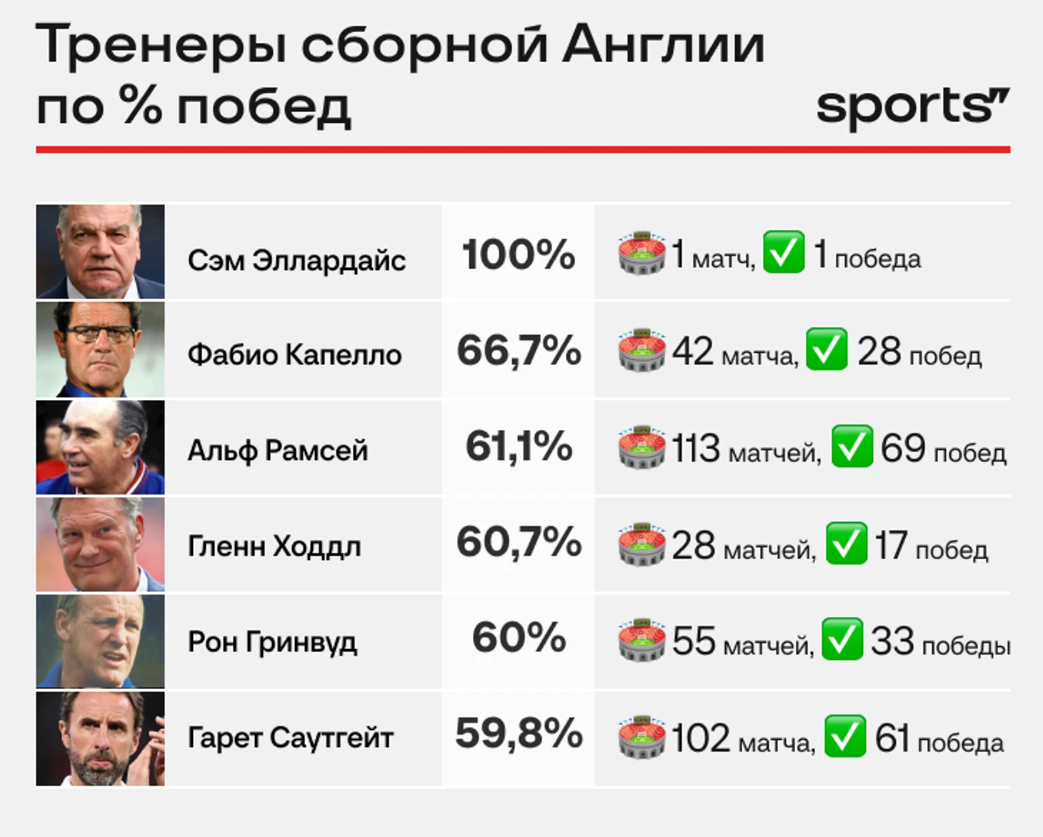 ● Если бы Англия победила в финале Евро-2024, Гарет по проценту побед поднялся на четвертое место – обошел бы Гленна Ходдла.