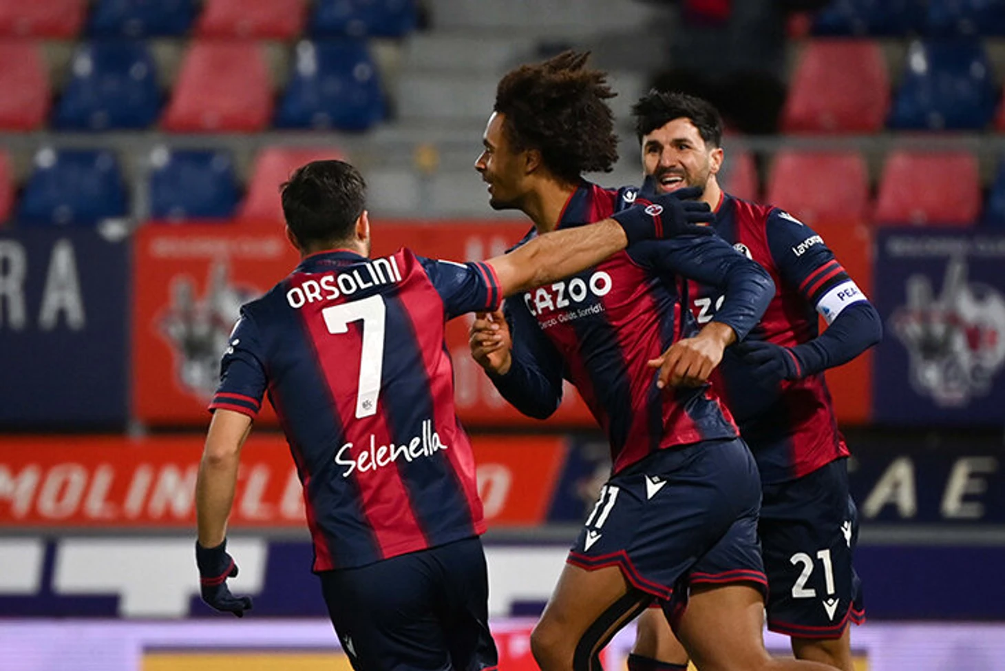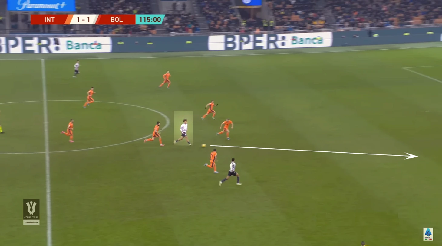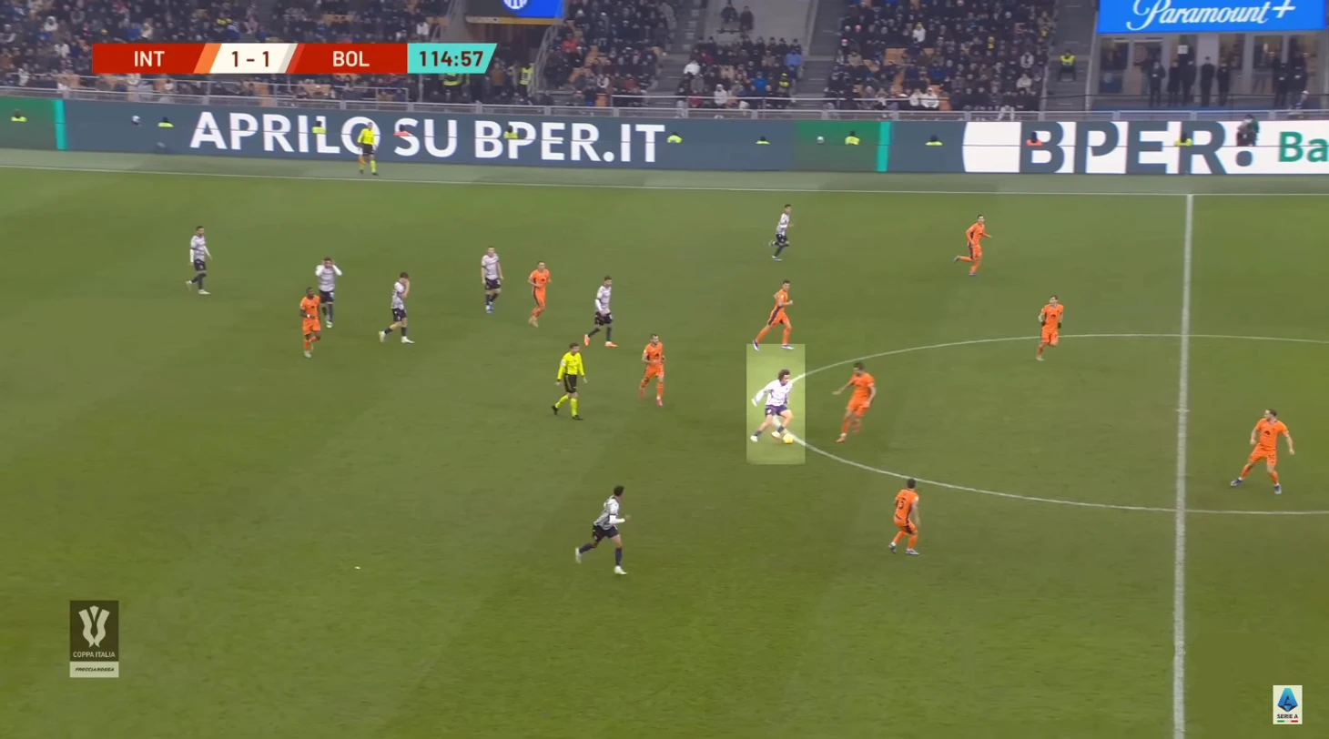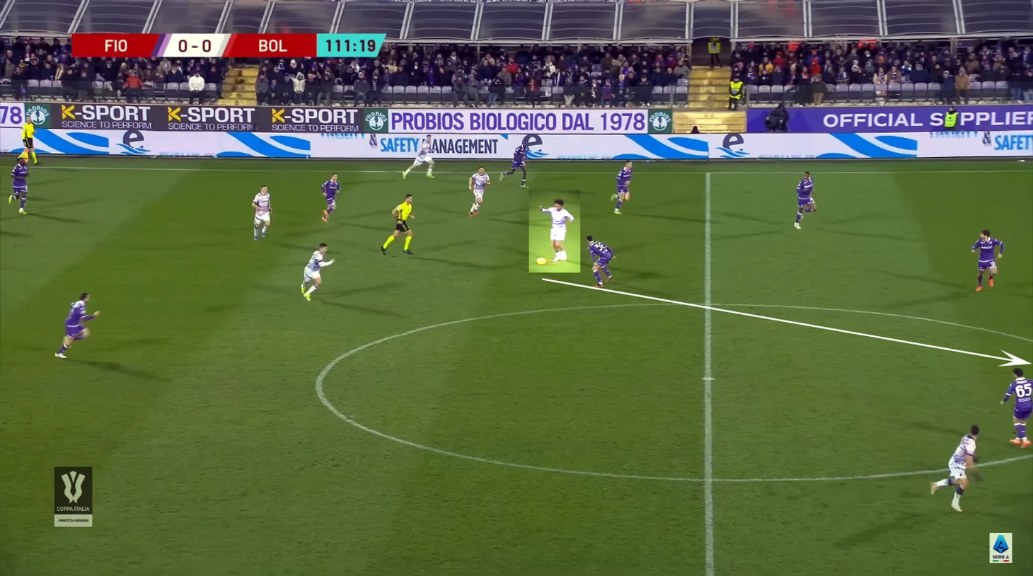 Вот как вингеры выигрывают от нахождения рядом с Зиркзе: обычный подбор в центре, болонская атака в численном меньшинстве – но голландец одним движением превращает бесперспективный эпизод в опасный момент. Сначала он пробросил защитнику между ног и разогнал контратаку.
