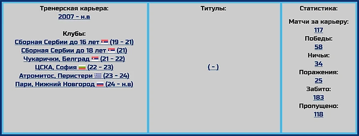 Пока понять в целом тренерскую характеристику работы серба в российском футболе достаточно сложно, вроде бы он вместе с командой и сумел остаться в элите, выиграв в концовке прошлого сезона важнейшие «переходные» игры, с другой стороны некоторые результаты крайне настораживают (1:6 от вылетевшего «Сочи», 2:6 от московского «ЦСКА», уже в новом сезоне поражения от грозненского «Ахмата» в кубке со счётом 1:4).