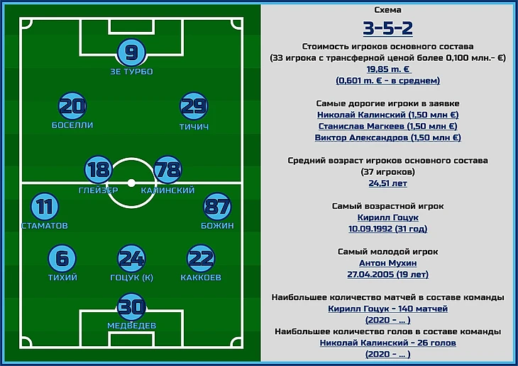 Пришедший в самой концовке прошлого сезона серб Саша Илич не стал что-то кардинально менять в построение игры нижегородцев, и так же, как и его предшественники, предпочитает играть с тремя центральными защитниками и крайне активными фланговыми игроками.