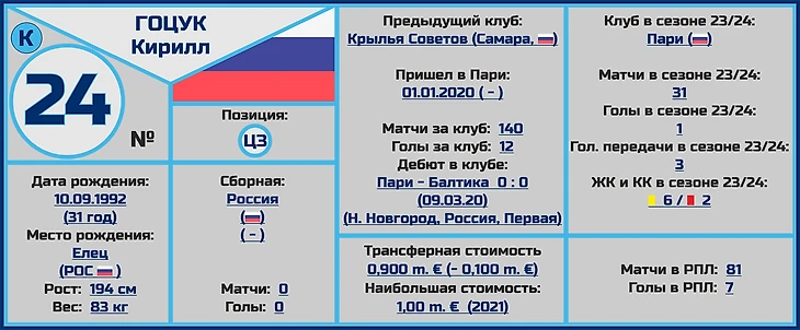 Кирилл Гоцук выступает в составе «Нижнего Новгорода» уже пятый сезон, и за это время сумел не только отлично проявить себя в защитных порядках и лидерских качествах (недаром капитан), но и отметился достаточно неплохим счетом забитых мячей (13 голов в 140 встречах за клуб).