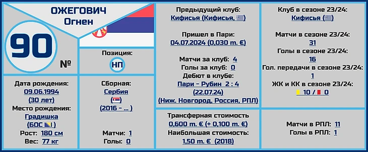 Огнен Ожегович футболист достаточно опытный, за свою 12-летнюю карьеру куда судьба его только не заносила, он поиграл только у себя на родине за 9 команд (!!!), включая выступления за оба флагманских клуба Сербии - «Црвена Звезда» (воспитанником которой он и является) и «Партизан» (где был заметной фигурой в атаке, 18 голов за 2,5 сезона), а ведь потом были китайский «Чанчунь Ятай», немецкий «Дармштадт», турецкие «Аданаспор» и «Маниса ББСК», а также греческие клубы «Волос» и «Кифисия».