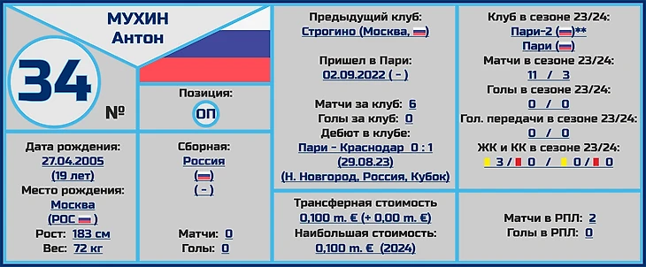 Мухин играет по большей части в центре поля, где конкуренция у «Пари» достаточно большая, но пока Антон появляется на поле достаточно часто, он принял участие в 2- матчах чемпионата и отыграл полную кубковую встречу, причем показал себя в этих играх крайне зрелым и обученным футболистом.