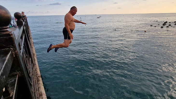 Кто-то ныряет с прилаженной к ограждению пирса доски.