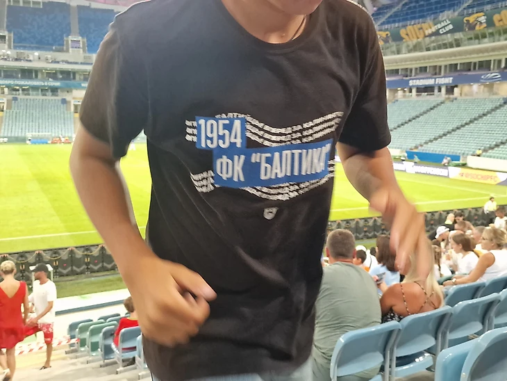 Успеваю заснять колоритных болельщиков «Балтики». Пара явно подготовилась к выезду: на футболке – хронологический список всех городов, где пройдут выездные матчи калининградцев, справа на поясе висят наготове клубные шарфики. Причем первый пункт в списке – Москва – уже помечен крестиком: неделей ранее самый западный клуб России сыграл нулевую ничью с ФК «Родина».