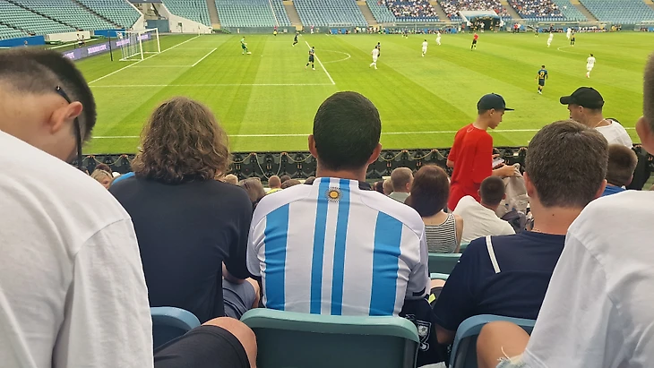 Но атмосфера дружелюбная, все следят за игрой, много детей и подростков. Вижу даже девочку на костылях и в украшенном рисунками гипсе стопы.