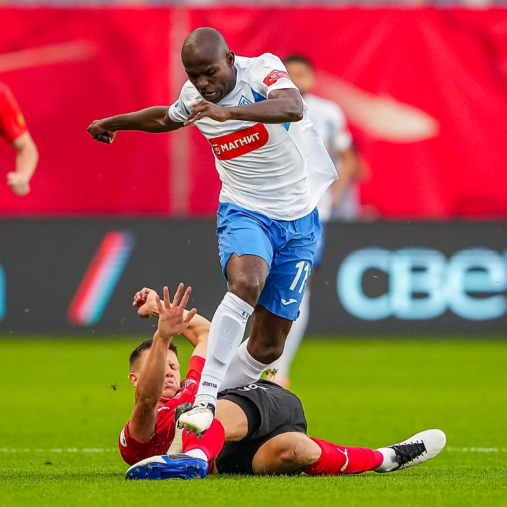К 32-й минуте встречи махачкалинцы выровняли владение мячом и создали первый по-настоящему опасный момент. Эгаш Касинтура пробил из-за штрафной в ближний угол ворот, но мяч отправился правее створа. А уже на 33-й минуте Ражаб Магомедов нашёл в штрафной Идара Шумахова, и центральный защитник «Динамо» открыл счёт в этой встрече, 0:1.