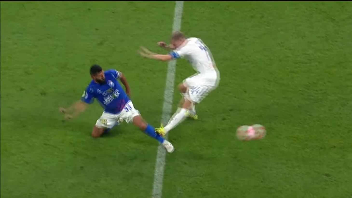 Несмотря на не лучший ракурс второго скрина - структура фола аналогичная - высоко поднятой ногой защитник бьет по боковой поверхности голени Глебова. Извините за то, что не нашел лучшего скрина - но с трансляции матча картинку брать - рисковать «баном» от правообладателя, а на ЮТуб, где есть правовая возможность взять фрагмент, ни Матч, ни РПЛ, ни даже казахи этот момент не выложили.