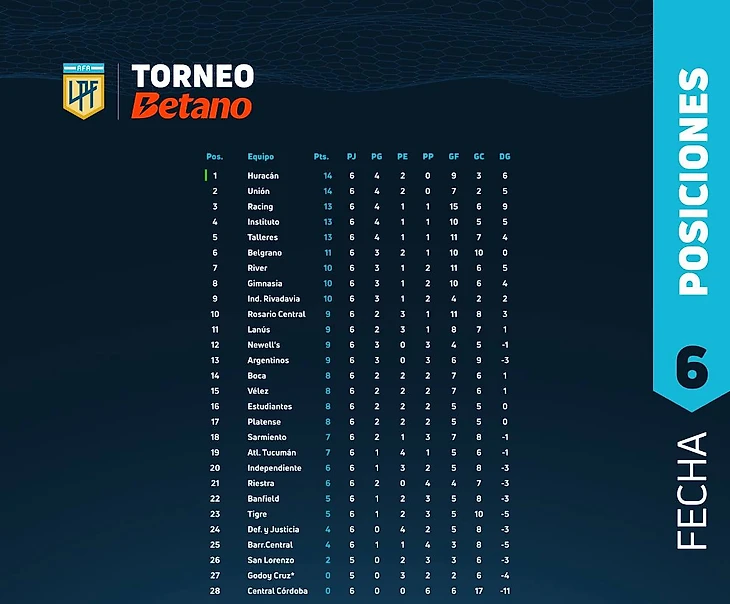 После шести матчей «Уракан» прекрасно себя чувствует на первом месте, а «Сан-Лоренсо» остается в подвале турнирной таблицы.