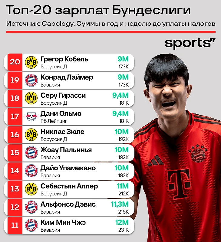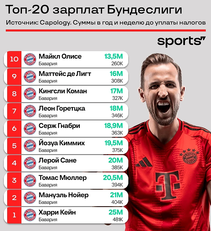 ● Целых пять игроков в топе не из «Баварии»! Из чемпионского «Байера» никого: больше всех получают Гримальдо и Шик (по 6 млн евро в год).