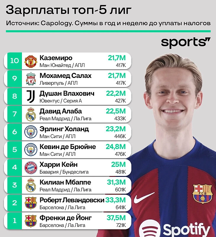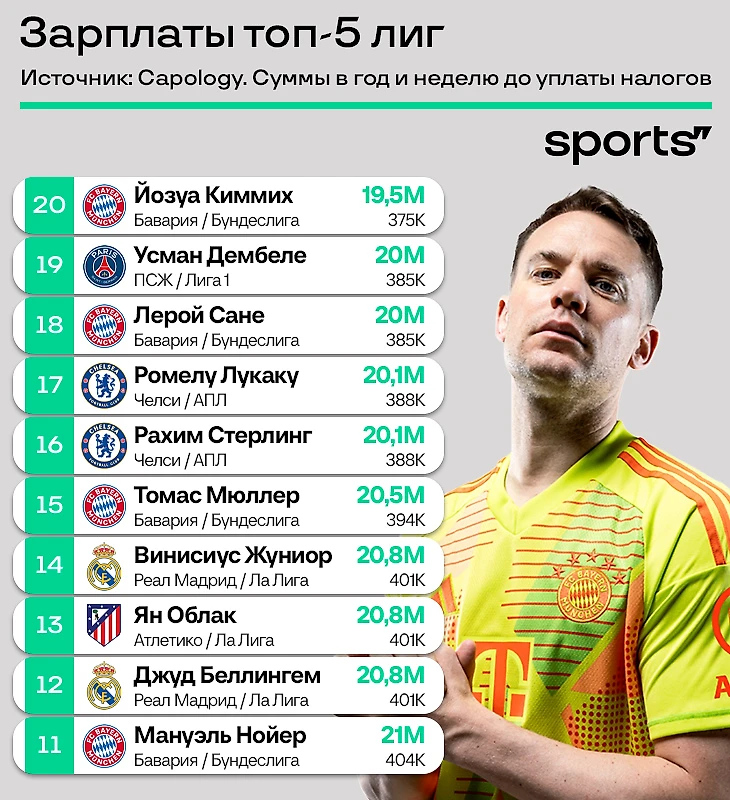 На основе данных Capology мы собрали рейтинг зарплат топ-5 лиг: отдельные двадцатки по каждой из лиг и общий топ.