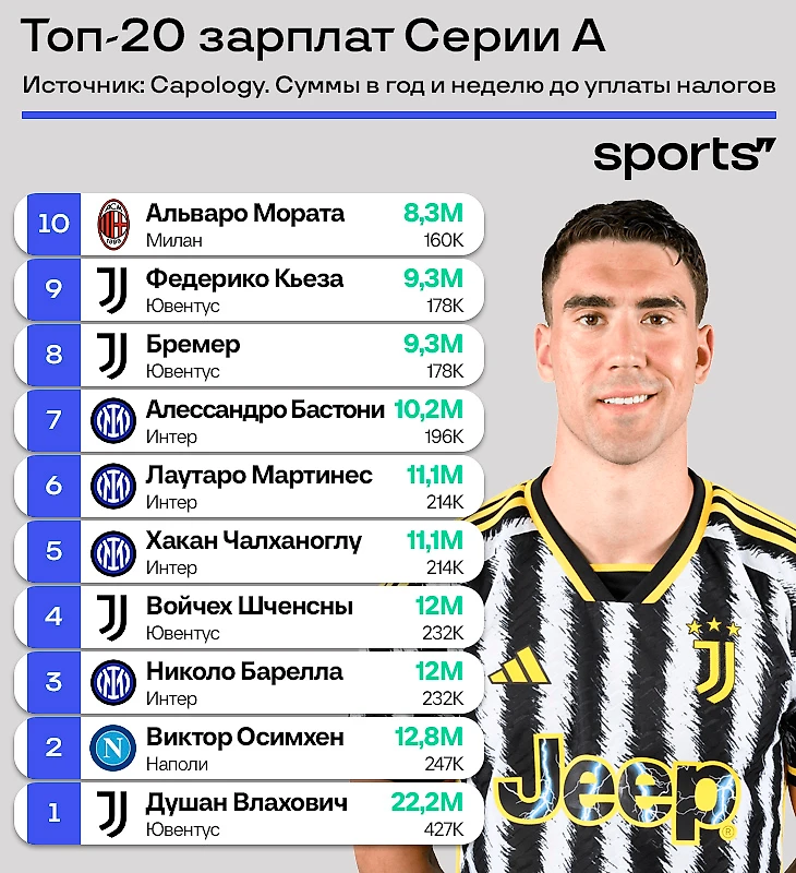 ● Душан Влахович получает почти в 2 раза больше любого другого игрока, но в чистых деньгах разрыв сильно меньше: 12 млн у серба, 10 – у Осимхена. Все из-за налоговых льгот Серии А: Влахович под них не подходит.