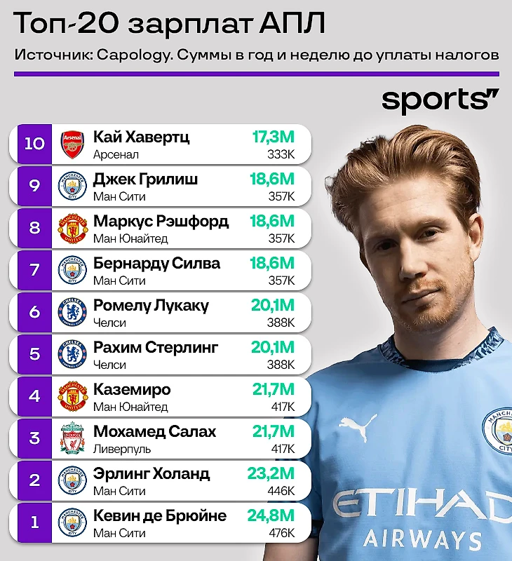 ● Кевин де Брюйне получает больше всех в АПЛ, если считать основную ставку зарплаты. Но с Холандом никто не сравнится, если учитывать бонусы: за голы, сыгранные минуты и выигранные турниры Эрлинг может зарабатывать еще 29 миллионов евро. Да, больше основной зарплаты.