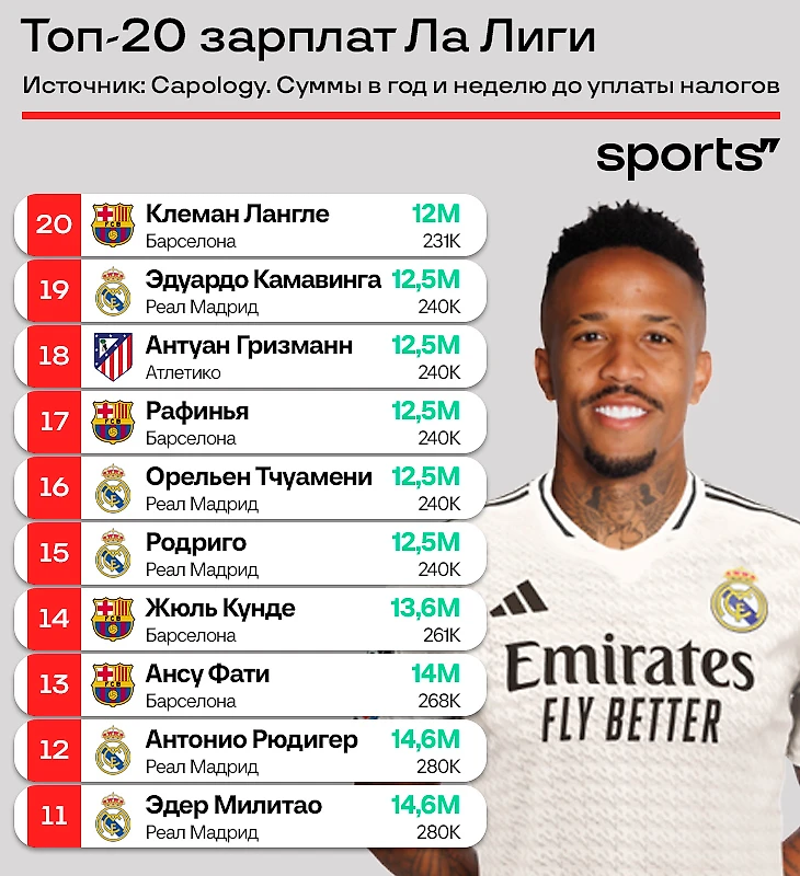 ● 0 игроков вне традиционной испанской тройки. Хотя сразу за двадцаткой идет Иньяки Уильямс из «Атлетика» с 11,4 млн евро в год.