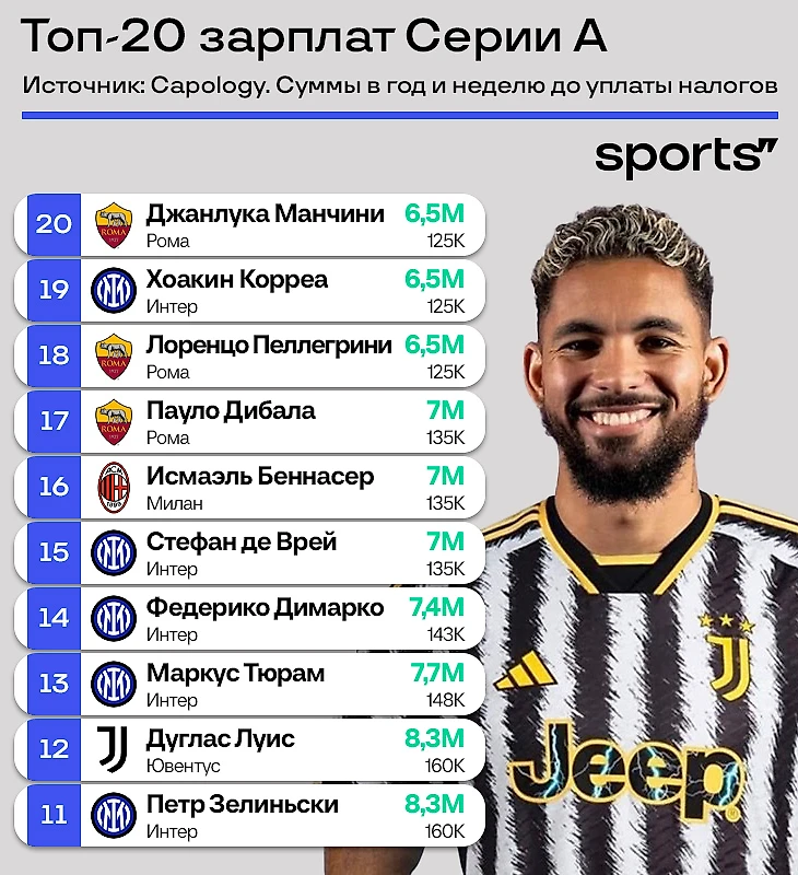 ● Новички сразу запрыгнули в топ: Дуглас Луис, Альваро Мората и Петр Зелиньски получают по 8,3 млн евро в год. А Николо Барелла просто продлил контракт с «Интером» на лучших условиях и влетел в топ-4.