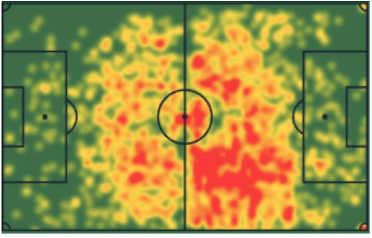 В начале сезона полузащитник стартовал со скамейки. Два выхода на замену - два гола. После этого он выходил в «старте» (почти) в каждой игре. На протяжении всего сезона испанец выполнял разные функции, от глубинного плеймекера до «ложной девятки».Взгляд на его тепловую карту подтверждает это, с небольшим уклоном на правый фланг.
