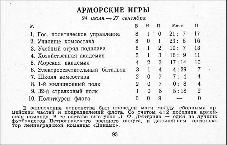 В истории есть термин, который определяет новую эпоху, «точка отсчета». Точкой отсчета можно назвать открытие нового континента, первый показ кинофильма или первый полет человека в космос. В футболе одной из таких точек отсчета стало 24 июля. Именно 24 июля 1922 года в Петрограде начался турнир команд вооруженных сил и флота, которые именовались Арморскими играми. Выиграв 8 игр из девяти, не проиграв ни одного матча и набрав 17 очков, победу в турнире одержала команда государственного политического управления. Именно эта команда уже через год приобретет свое легендарное имя «Динамо».