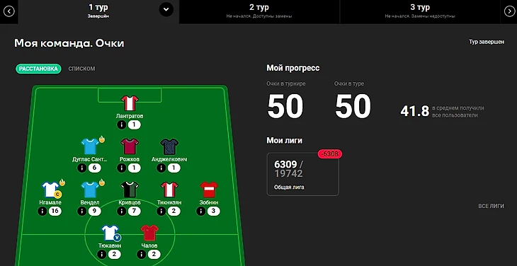 В первом туре отмечу несколько успехов: защитник Зенита (любой основной, в нашем случае Дуглас Сантос) - обязательная опция до конца сезона. Капитан Нгамалё - не самый очевидный (и не самый успешный) вариант, хуже Глушенкова и даже Давида Волка, но в Махачкале или Зените он не выступает. Вендел - тоже очень неплохой пик, в паре с Глушенковым работал бы отлично. Кривцов - главный выбор из Краснодара на ближайшие несколько матчей.