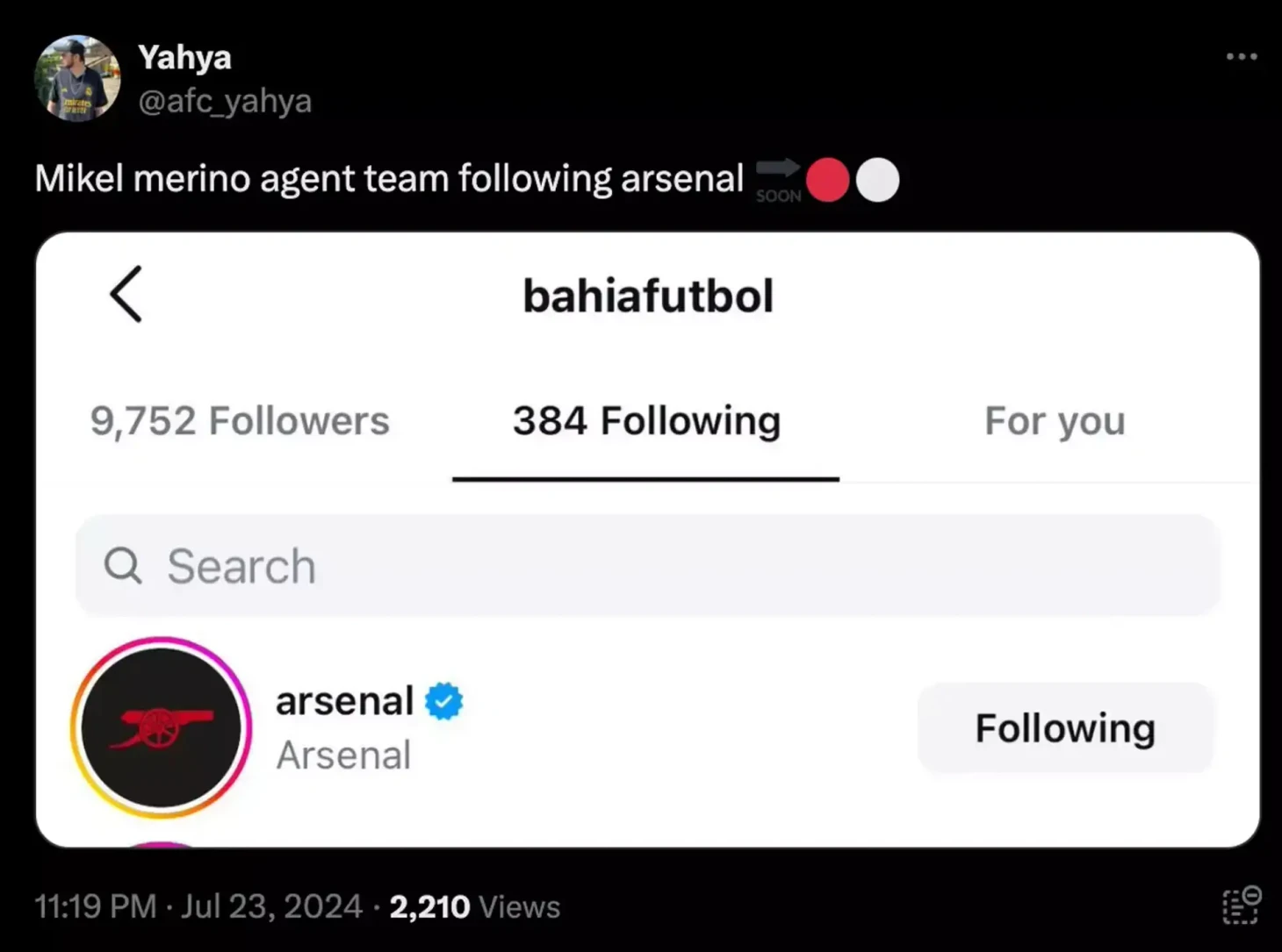 Агент Микеля Мерино подписался в соцсетях на лондонский «Арсенал». Всё бы ничего, но буквально несколько часов назад появились слухи, что Мерино договорился о личных условиях контракта с «канонирами».