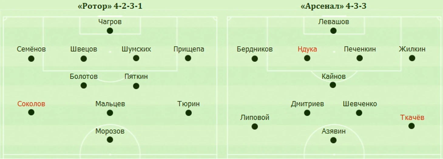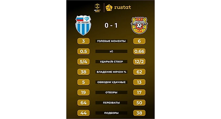 ● «Арсенал» одержал три победы в трёх турах с одинаковым счётом 1:0 и, набрав девять очков из девяти возможных, возглавил таблицу Первой лиги. ● «Арсенал» восемь матчей подряд играет с тоталом меньше 2.5. ● Впервые за семь официальных матчей «Ротора» и «Арсенала» победа оказалась на стороне гостевой команды.