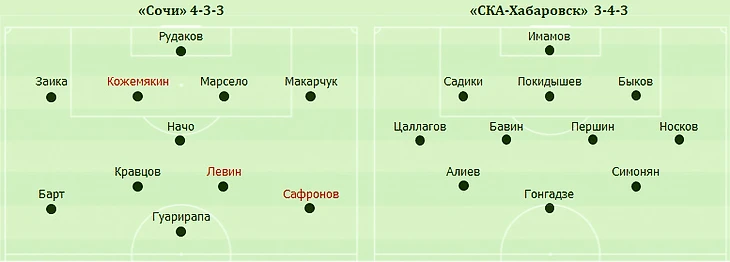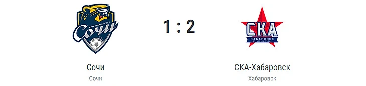 Голы: Гонгадзе, 43 (0:1). Алиев, 79 (0:2). Кожемякин, 90+1 (1:2). «Сочи»: Рудаков, Заика, Марсело Алвес, Кожемякин, Макарчук (Магаль, 60), Кравцов (Шагиахметов, 76), Сааведра, Левин (Федоров, 81), Барт (Бурмистров, 76), Гуарирапа, Сафронов (Крамарич, 60). «СКА-Хабаровск»: Имамов, Садики (Журавлев, 73), Быков, Покидышев, Цаллагов, Бавин, Першин (Гаджимурадов, 78), Носков (Поярков, 78), Симонян (Мирошниченко, 73), Алиев, Гонгадзе (Гонгапшев, 58). Наказания: Заика, 45+1. Марсело Алвес, 59. Першин, 75. Имамов, 82 (предупреждения). Судья: Фалов (Москва). 28 июля. Сочи. Стадион «Фишт». 5633 зрителя.