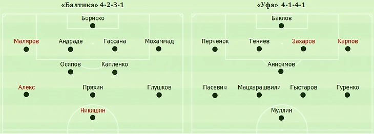 Голы: Гуренко, 35 (0:1). Пряхин, 56 (1:1). «Балтика» (Калининград): Бориско, Маляров, Андраде, Гассама, Мохаммад (Петров, 71), Осипов (Терентьев, 71), Капленко (Аванесян, 46), Фернандес, Пряхин (Стефанович, 80), Глушков, Никишин (Саусь, 87). «Уфа»: Баклов, Теняев, Захаров, Карпов, Перченок, Анисимов, Гыстаров (Исаев, 62), Гуренко, Мацхарашвили, Пасевич (Гараев, 80), Муллин (Ложкин, 87). Наказания: Андраде, 20. Гыстаров, 21. Анисимов, 33. Перченок, 47. Теняев, 79. Баклов, 90+5 (предупреждения). Судья: Машлякевич (Москва). 26 июля. Калининград. Стадион «Ростех Арена». 10 755 зрителей.