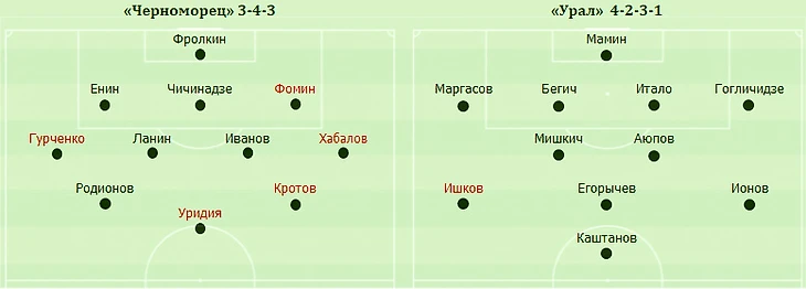 Умопомрачительная концовка украсила и без того добротный и зрелищный первый тайм в Новороссийске. Быстрый гол Ильи Ишкова на исходе стартовой десятиминутки закрепил дебютную солидность «Урала». Он был забит после быстрой контратаки. Егорычев продвинулся вперёд по центру и своевременно покатил мяч налево на Ионова, после прострела которого Ишков ударом в касание переиграл Фролкина.
