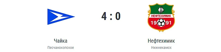 Голы: Бамматгереев, 29 (1:0). Библик, 41 (2:0). Янов, 63 (3:0). Руденко, 82 (4:0). «Чайка» (Песчанокопское): Штепа, Пелих, Нестеров (Евдокимов, 68), Кармаев, Пивоваров (Ивашин, 57), Янов (Маляров, 67), Зарыпбеков, Хохлачев, Бамматгереев (Руденко, 56), Библик (Николаев, 70), Кожедуб. «Нефтехимик» (Нижнекамск): Янович, Валиахметов (Кахидзе, 75), Толстопятов (Сагуткин, 46), Шоркин, Ситдиков, Петров, Родин (Морозов, 46), Емельянов (Першин, 78), Шильцов (Шарифуллин, 74), Джамилов, Алиев. Наказания: нет. Судья: Целовальников (Астрахань). 28 июля. Песчанокопское. Стадион имени И.П. Чайки. 1478 зрителей.