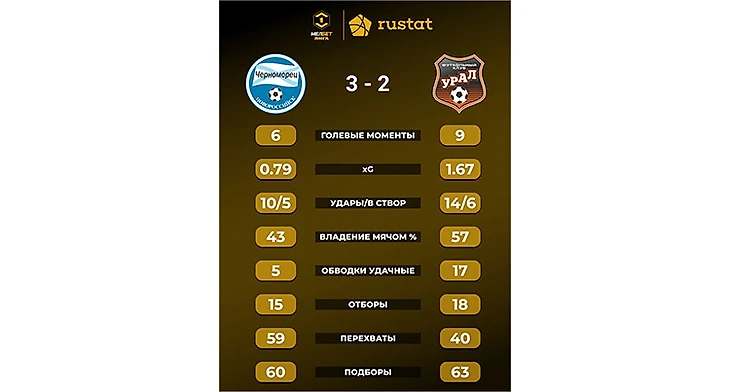 Однако «моряки» добавили и забили три гола! Сначала Мераби Уридия вывалился один на один с вратарём, успел пробить в дальний угол, но за «Урал» сыграла штанга. А на 30-й минуте случился автогол Лео Гогличидзе, срезавшего мяч в свои ворота после прострела новороссийца Кротова.