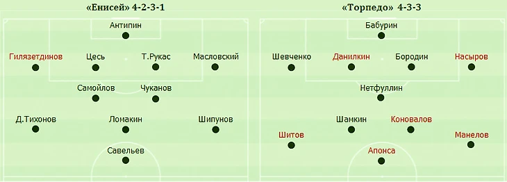 По сравнению с предыдущим матчем в Волгограде тренерский штаб «Торпедо» поменял сразу шесть футболистов стартового состава. Один из них – защитник Иваньков – не смог сыграть в Красноярске из-за микротравмы, а вот решения по остальным были чисто тренерскими. И это вполне объяснимо, если учесть, что «Енисей» благодаря календарю имел на подготовку «лишние» 48 часов. «Торпедо» готовилось всего три дня, совершив перелеты по маршрутам Волгоград – Москва и Москва – Красноярск…