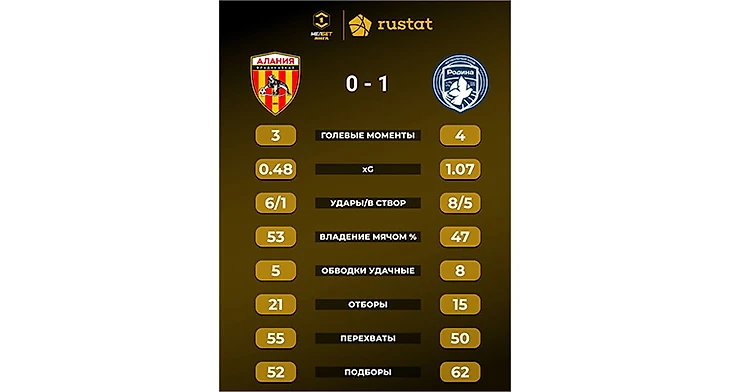 ● «Алания» в седьмой раз подряд сыграла первый тайм вничью. ● «Алания» пропустила первый мяч за последние шесть матчей. ● «Родина» не проигрывает первый тайм в гостях 15 матчей подряд.