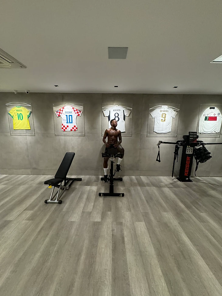 Как и любой футболист, бразилец может похвастаться целой коллекцией маек коллег по цеху. Некоторыми экспонатами Вини решил украсить интерьер тренажерки.