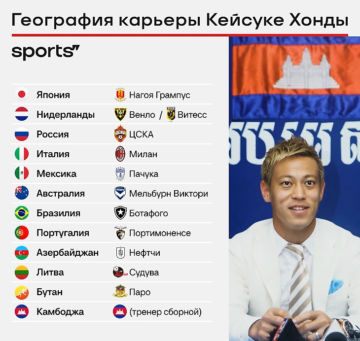 А страна при этом уже 11-я в игровой карьере и 12-я – в футбольной. С небольшой оговоркой – Хонда подписал контракт с португальским «Портимоненсе», но не сыграл из-за проблем с регистрацией.