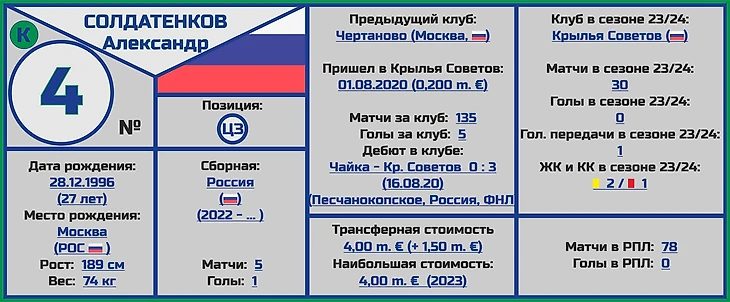 Центральный защитник команды Александр Солдатенков был одним из первых игроков обновленных «Крыльев Советов», кто вместе с главным тренером перешёл в клуб из «Чертаново».