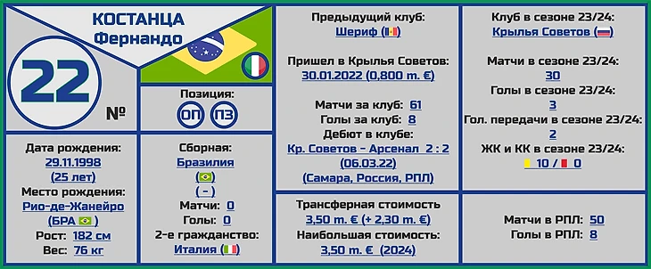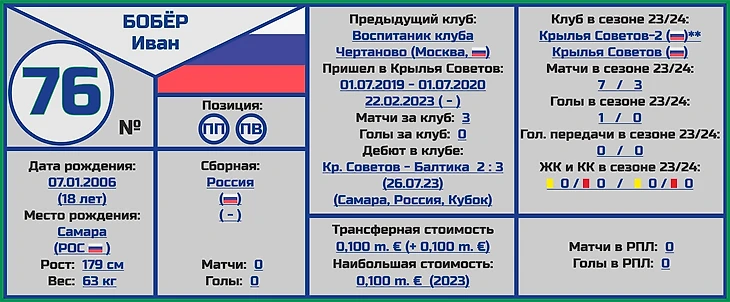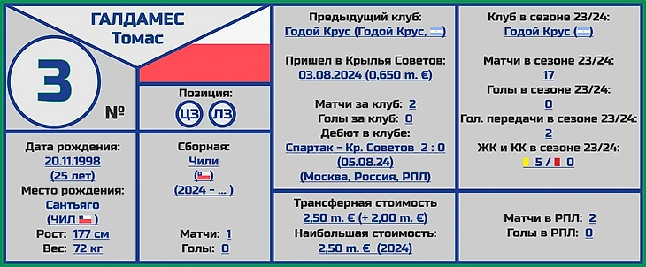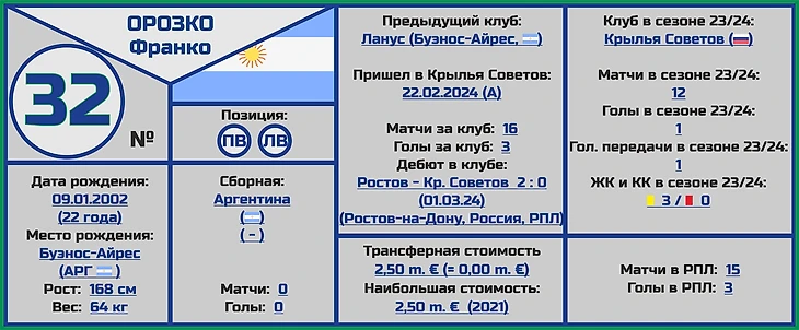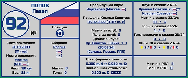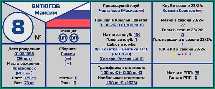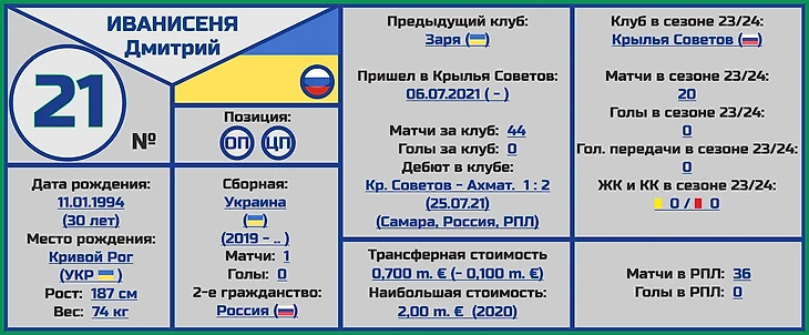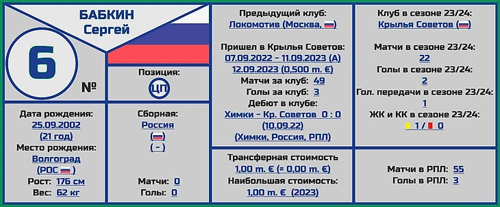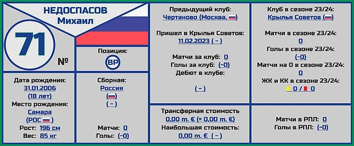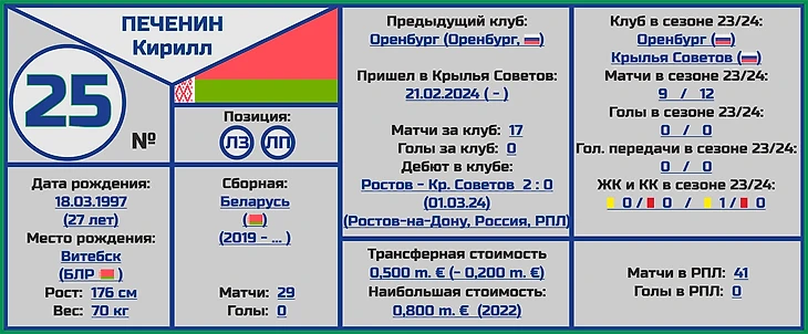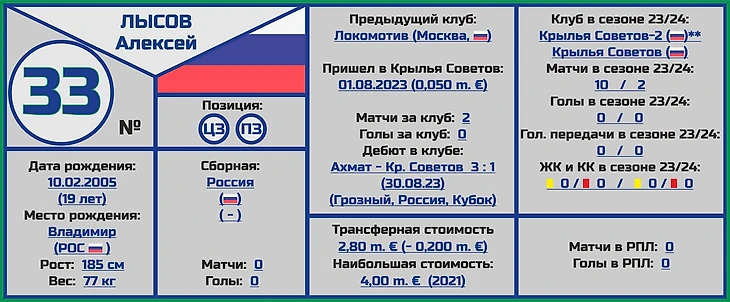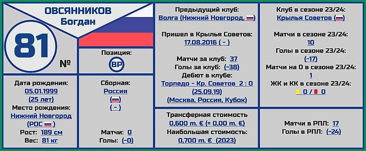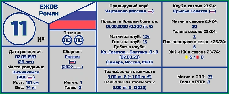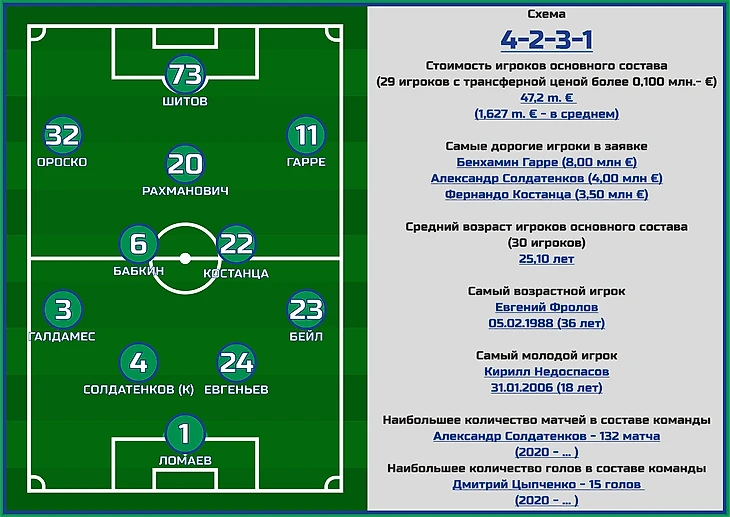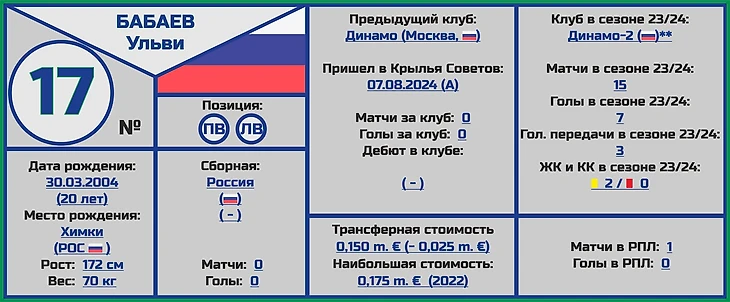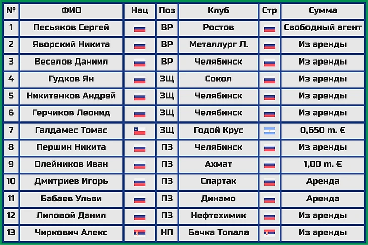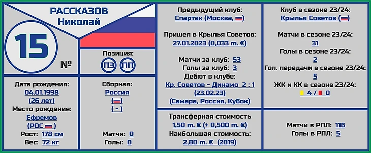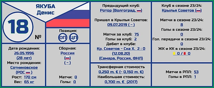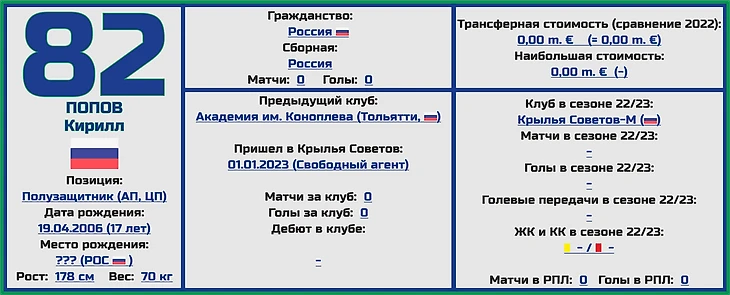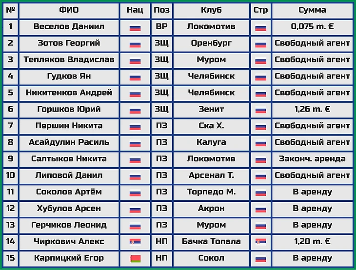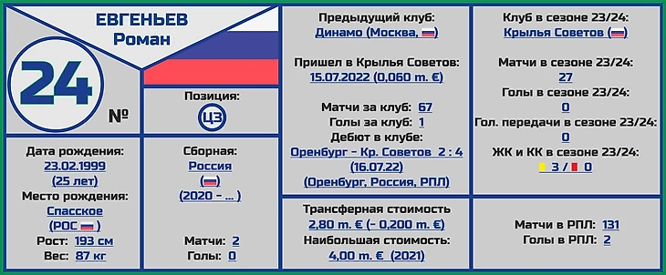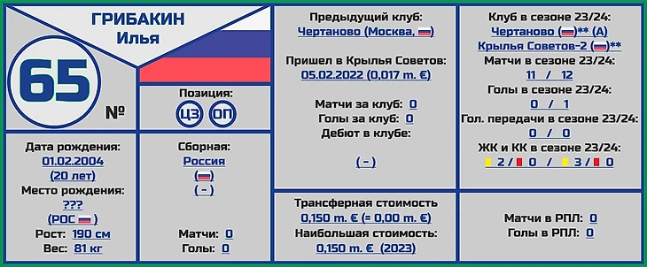 * Все трансферные суммы переходов и оценки стоимости игроков и клубов взяты с сайта www.transfermarkt.world, вся информация по поводу правильного написания ФИО даты и места рождения, веса и роста футболистов по большей части с официальных сайтов клубов РПЛ.