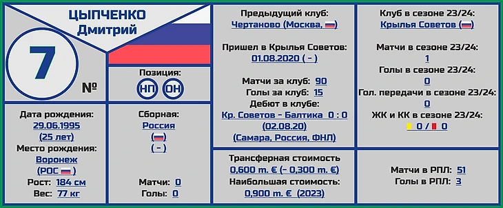 В прошлом сезоне, по понятным причинам, был не доступен для основного состава, но сейчас он вернулся, и наверняка хочет доказать всем, что тот неудачный период его карьеры позади, а сейчас настало именно время Дмитрия Цыпченко.