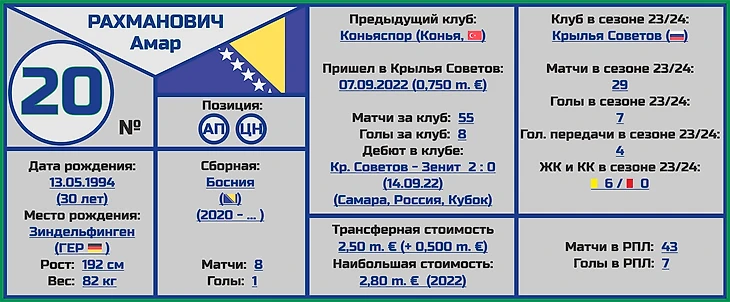 На его счету за два неполных сезона уже 12 забитых в составе «крылышек» мячей + 5 результативных передач, а его трансферная цена выросла за время пребывания в России почти в 4 раза (по данным популярного портала transfermarkt купили «Крылья» его за 1.7 млн евро, а сейчас его стоимость оценивается уже в 8 млн. евро).