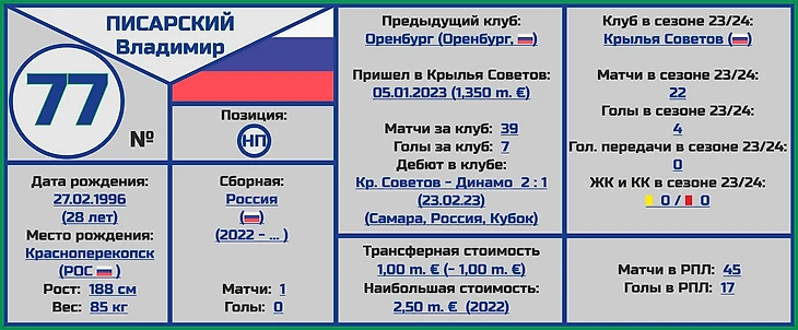 Владимир Писарский (некогда главное открытие российской Премьер-Лиги сезона 2022/23 к своим феноменальным 14 голам за «Оренбург» в первой части того сезона пока что смог добавить только лишь 3 забитых гола за два года в Самаре, но в клубе надеются, что Владимир все же наберет форму и будет забивать все же чаще).