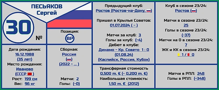 В целом же вратарь очень высокого класса, для самарских «Крыльев Советов» может стать настоящим приобретением, тем более что у клуба с этой позицией вроде бы и так все нормально, но вот прям основного и стабильного все никак нет, и может именно Песьяков станет таким для них на ближайшие несколько лет.