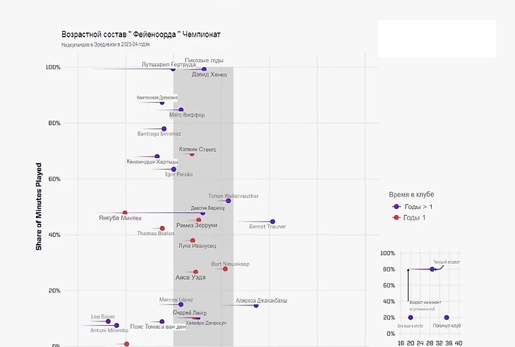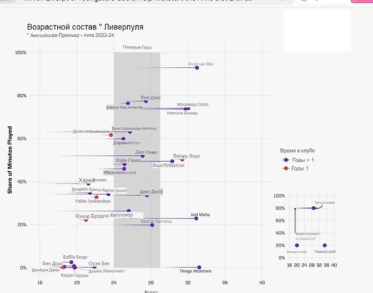 Как можете вдиеть из приведенных графиков ниже Клопп действительно давал много шансов молодежи но в основном полагался на опыт в то время как основные игроки Слота часто были немного молодеже 10 из 25 игроков который он использовал 23 года или моложе.