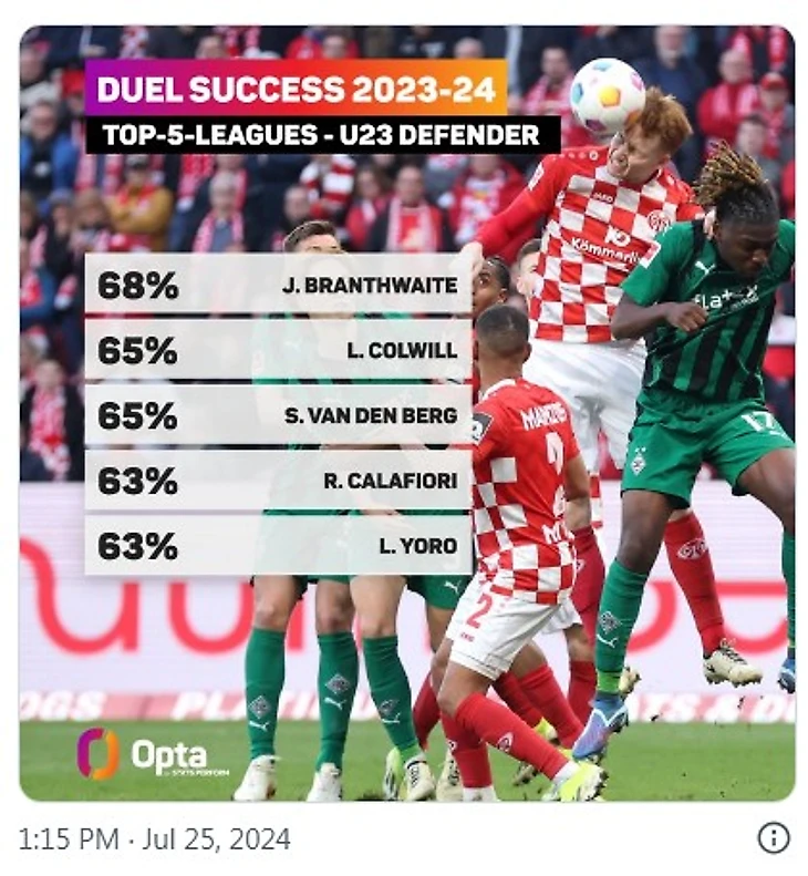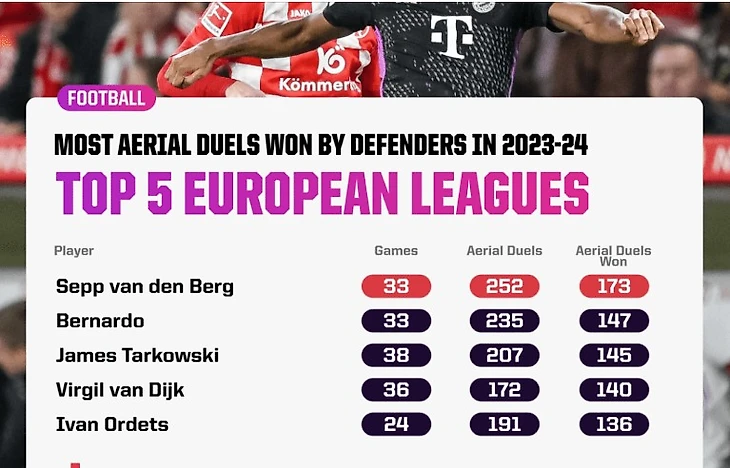 Из защитников до 23 лет в прошлом сезоне, которые провели не менее 165 поединков, только Джаррад Брэнтвейт из «Эвертона» (68%) имел лучший показатель и дуэли в пяти лигах Европы, чем Ван ден Берг (65%), при этом он занимал место рядом с Леви Колвиллом и опережал Риккардо Калафиори и Лени Йоро.