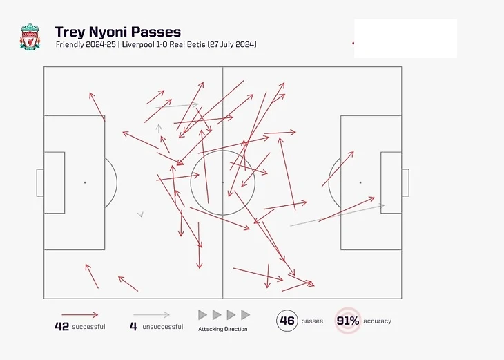 Однако, если судить по ранним признакам предсезонной подготовки, похоже, что Слот является большим поклонником 17-летнего игрока. Ньони заменил Кертиса Джонса в середине первого тайма товарищеского матча против «Реал Бетиса» в пятницу, и он поразил всех болельщиков в Питтсбурге своим похождением через линии и умением создавать время и пространство на себя. Это всего лишь одна игра, но факт, что Слот обратился к нему в качестве своей первой замены, опередив таких игроков, как Мортон и Байсетич, показывает впечатление, произведенное сборной Англии до 18 лет этим летом.