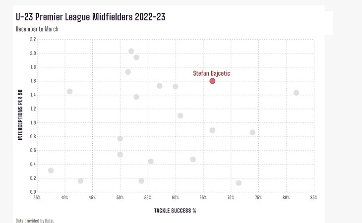Как вы можете видеть из проведенного графика выше, его показатели по перехватам и успешности подборов в течение периода, когда он был игроком регулярного сезона 2022-2023 года, сравнялись с одним из лучших молодых полузащитников Премьер-лиги. В период с декабря 2022 года по март 2023 года Байчетич занимал четвертое место по количеству перехватов за 90 минут. Ему всего 19 лет, и в предстоящем сезоне будет с нетерпением ожидать его развитие, если он сможет забыть о проблемах с травмами.