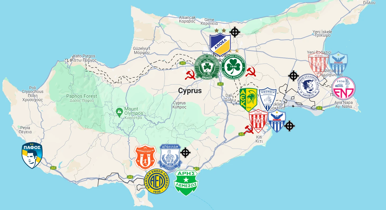 В целом, по стране клубы распределены так. Прозрачным обозначил Фамагусту, из которой после захвата южной части Кипра Анортосис и Неа Саламина перебрались в Ларнаку.