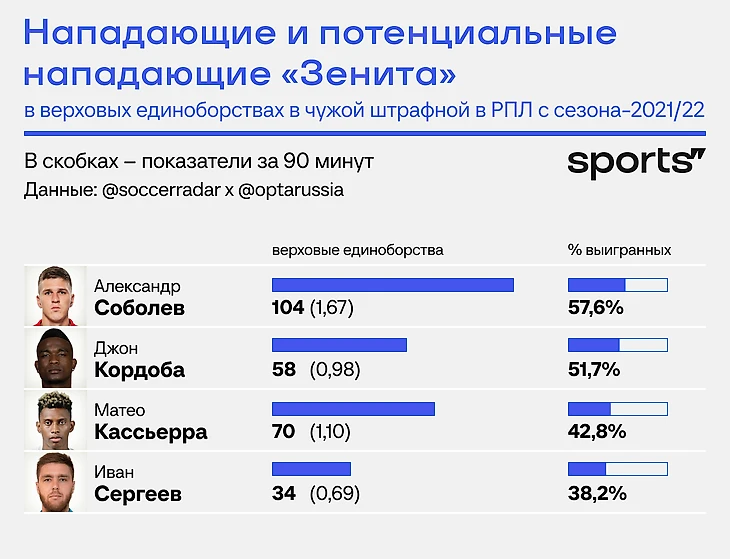Более того, Кассьерра уступает и Соболеву, и Кордобе в качестве верховой борьбы в штрафной. Сергеев в нее вступает и реже, и хуже всех.
